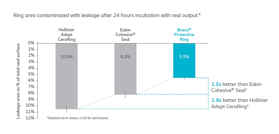 Designed to fill dips, creases, and folds in the skin around the stoma to provide a better seal between the skin and baseplate, protecting the skin from leakage. Brava® Protective Ring was found to significantly reduce leakage compared to competitors.**
