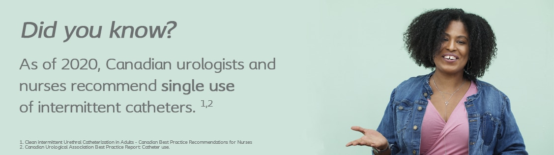 As of 2020, Canadian urologists and nurses recommend single use intermittent catheters, ideally those that are hydrophilic or pre-lubricated.1,2 In fact, Canadian nurses no longer support the re-use of intermittent catheters at all.1