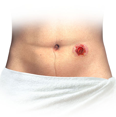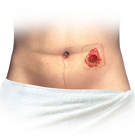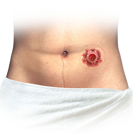 The illustrations below show four varieties of severe skin irritations. Symptoms are dark blue/purple marks, weeping, bleeding, burning or itching skin around the stoma. To resolve this – it is recommended to consult a healthcare professional. In the meantime, the Trouble Shooter tool may help you with this.