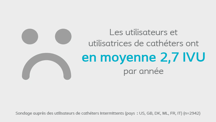 Les IVU sont une source de préoccupation quotidienne chez 41 % des utilisateurs de cathéters*. Si vous avez des inquiétudes ou vous ne savez pas comment prévenir les IVU, sachez que vous n’êtes pas seul. En effet, plusieurs utilisateurs de cathéters contracteront deux ou plusieurs IVU chaque année, ce qui représente une source de préoccupations importante.